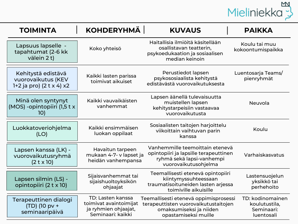 Yhdistyksen tarkoituksena on tukea ja edistää lasten mielenterveyden kehittymistä kodeissa, kouluissa ja muissa arjen elinympäristöissä vahvistamalla vanhempien sekä muiden aikuisten vuorovaikutusosaamista.